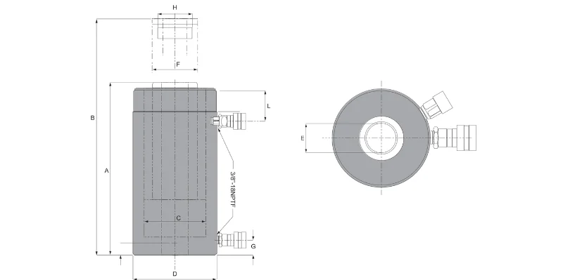 | Nimike | Isku (mm) | Lepokorkeus (mm) | C (mm) | Ulkohalkaisija D (mm) | Reiän sisä-Ø E (mm) | F (mm) | G (mm) | L (mm) | Öljytilavuus nosto (cc) | Öljytilavuus veto (cc) | Männän pinta-ala nosto (cm²) | Männän pinta-ala veto (cm²) | Paino (kg) |