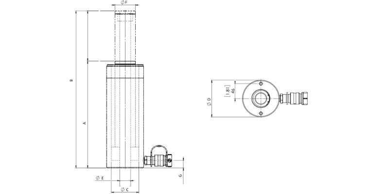 Nimike Isku (mm) Öljytilavuus (cc) Männän pinta-ala (cm²) Lepokorkeus A (mm) Rungon  sisä-Ø C (mm) Ulko-Ø D (mm) Reiän Ø E (mm) Männän Ø F (mm) Pohja – liitin G (mm) Paino (kg)